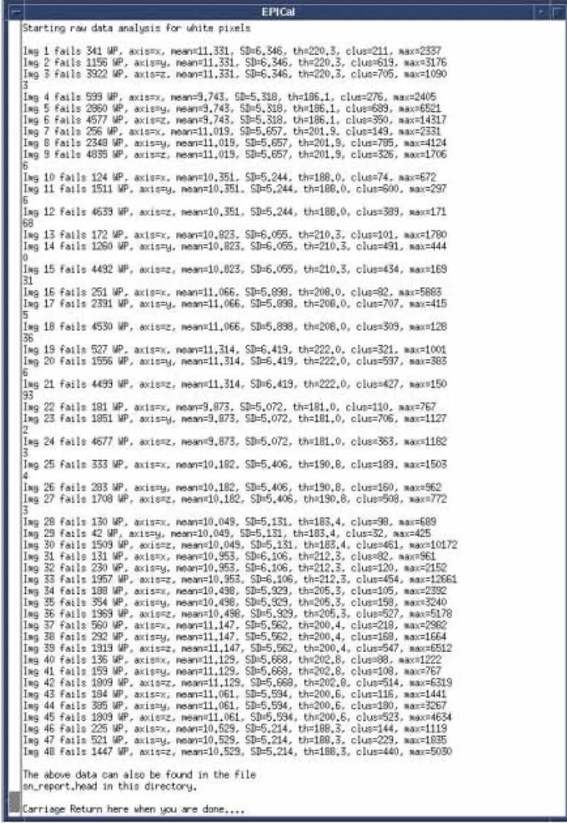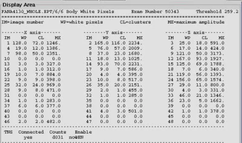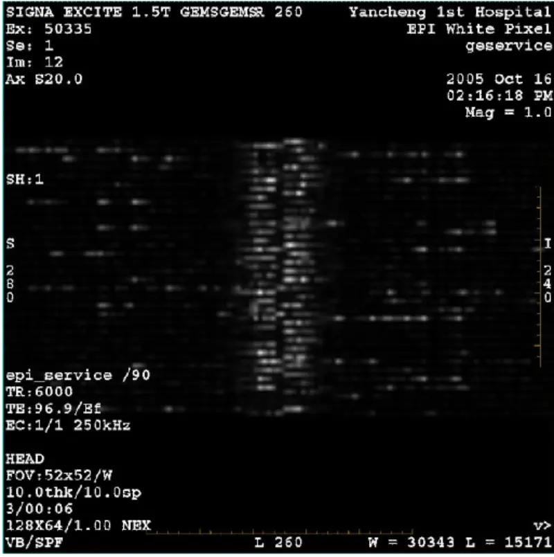 11. Odklopite optična vlakna z gradientnim pogonom X, Y in Z na plošči GP, belo slikovno glavo EPT in skeniranje telesa. rezultat je uspešen. Označuje, da je beli piksel induciran z gradientom. Vidimo, da beli piksel ni prisoten samo na eni osi. Nato zamenjajte ploščo SGA PS, GP, vendar je težava še vedno. Ponovno povežite optična vlakna Gradient Drive X,Y,Z.