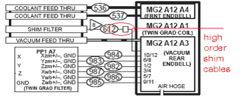 15. Odstranite sprednji pokrov magneta. Preglejte ozemljitveni kabel RF oklopa in kabel senzorja temperature. Kabel je OK.