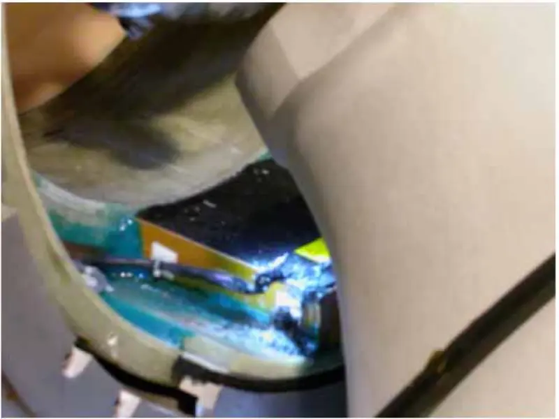 Iz zgornjih ukrepov in analize sklepamo, da bi težavo morala povzročiti gradientna tuljava. Tako odstranimo sprednji in zadnji pokrov magneta, preverimo in zategnemo vijake, povezane z gradientno tuljavo. Po odstranitvi zadnjega pokrova magneta ugotovimo, da je podložni kabel višjega reda pregorel v črno.